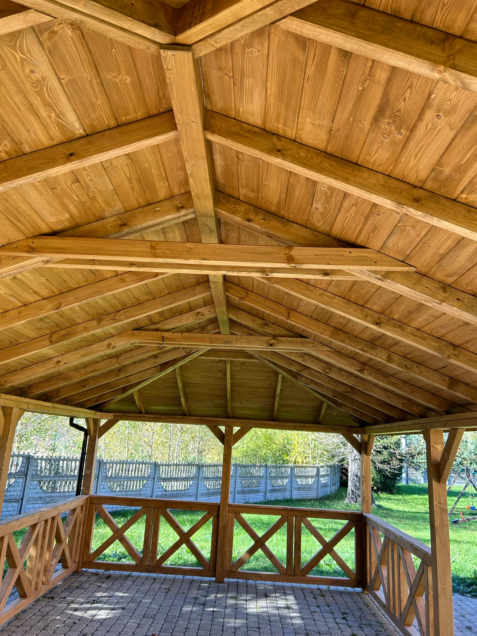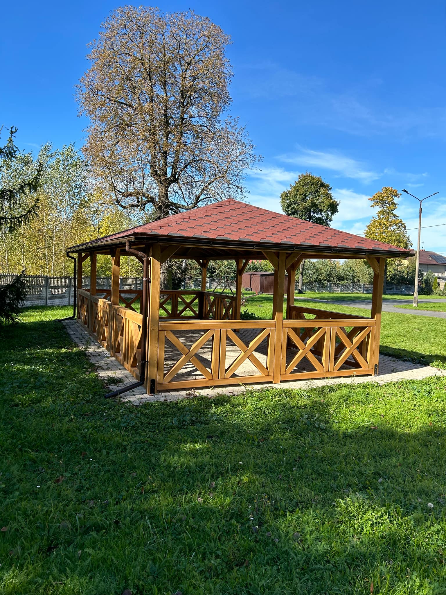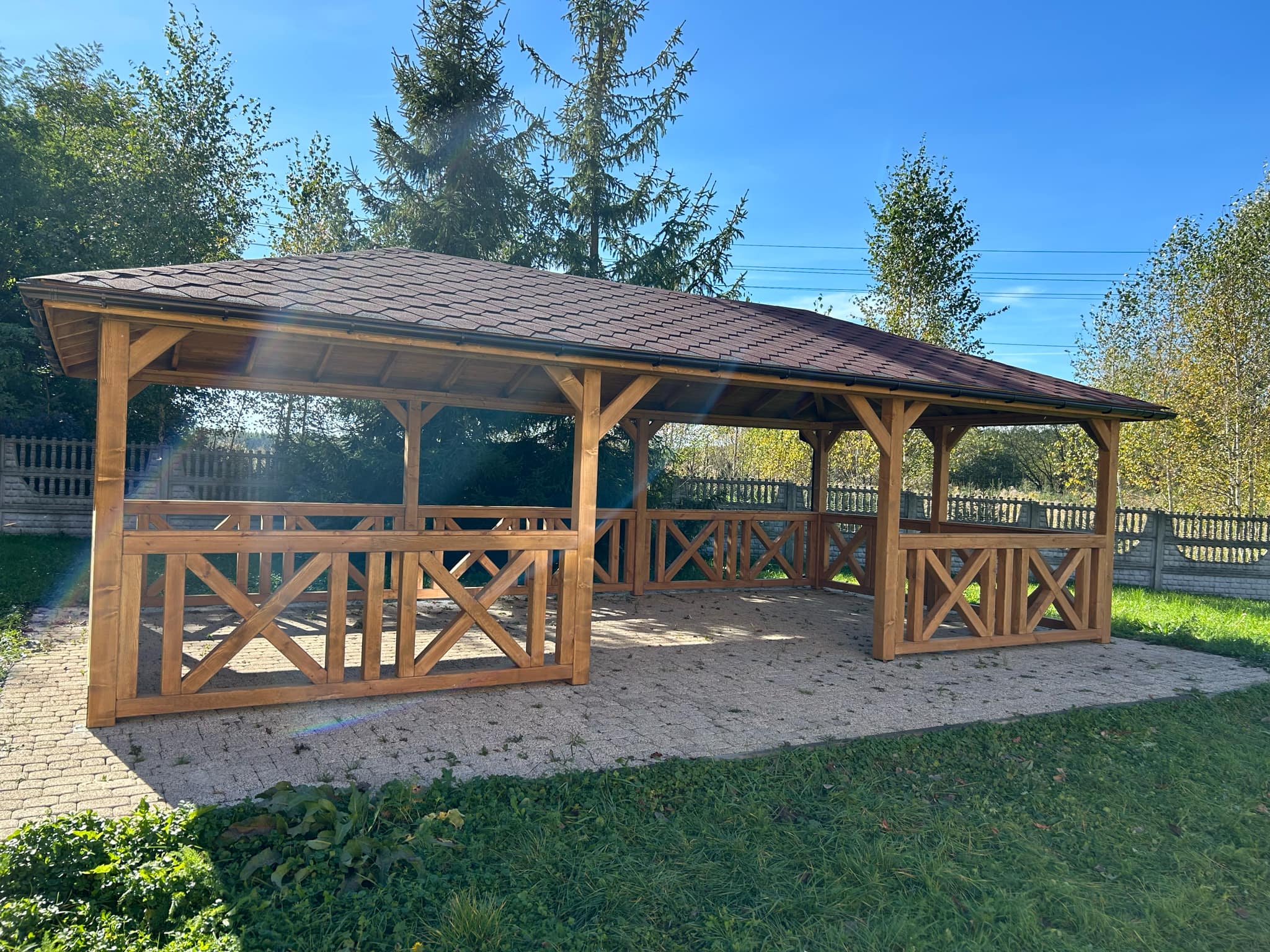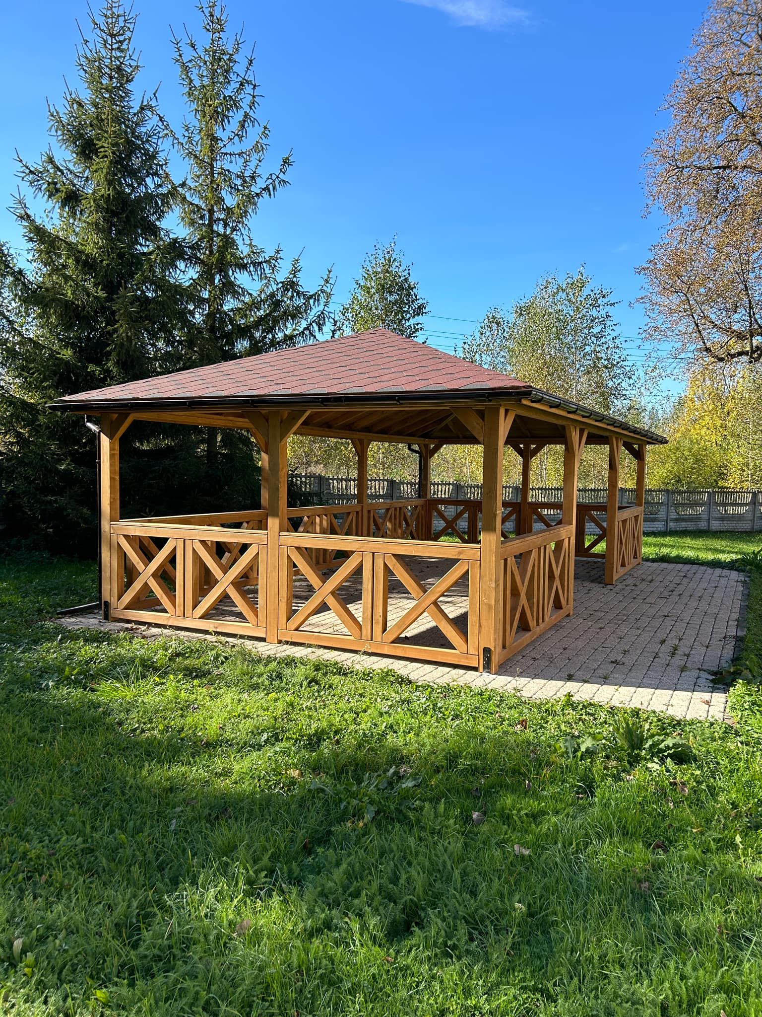 Altana została wykonana z wysokiej jakości, impregnowanego drewna w kolorze dąb, co zapewnia jej długowieczność i odporność na warunki atmosferyczne. Dach pokryty czerwonym gontem bitumicznym nadaje całości klasycznego charakteru i skutecznie chroni przed deszczem oraz słońcem. Altana posiada wysokość ścian bocznych 2 m, a całkowita wysokość konstrukcji wynosi 3,2 m. Całość opiera się na mocnych słupach nośnych o grubości 12 cm, co gwarantuje stabilność i długowieczność konstrukcji.